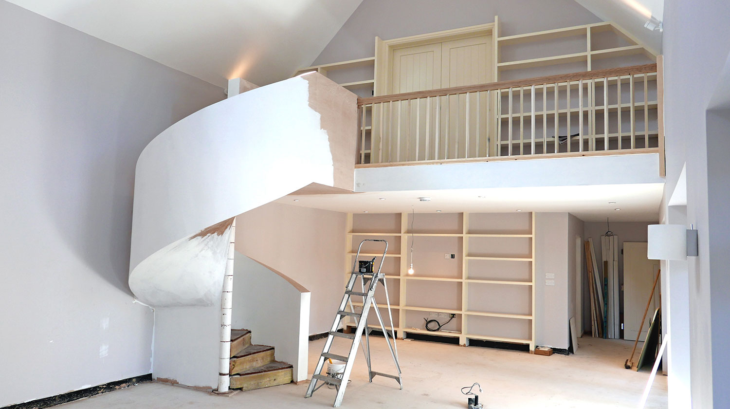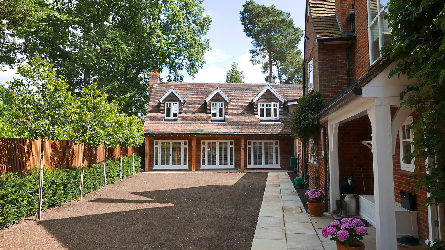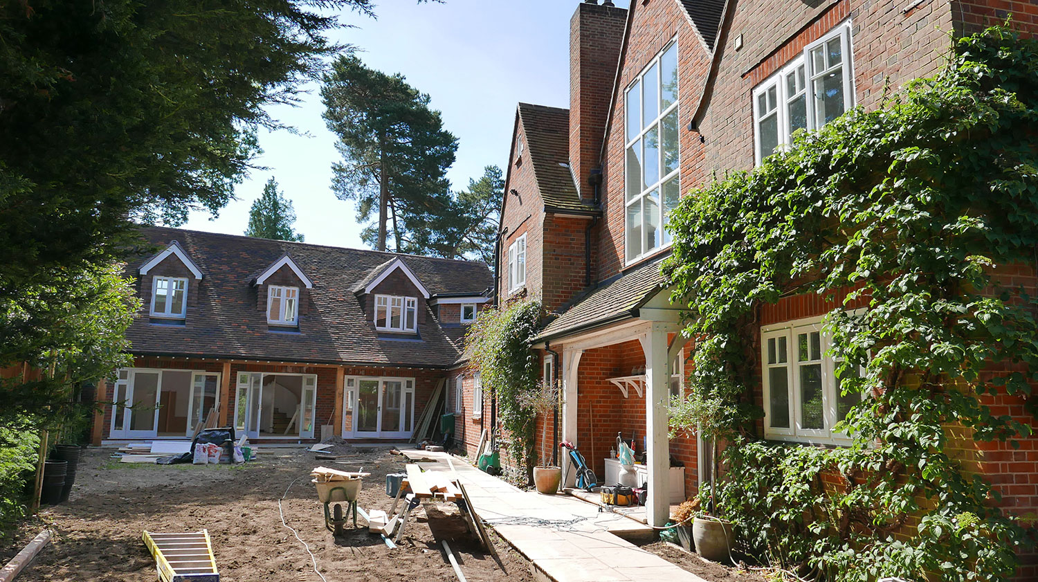 A large extension to a substantial early 20th century house to create a vast double height Entertaining Room with a spiral staircase to a galleried library. At first floor level a new Guest Suite has been created plus another staircase linking it to a new lobby and side entrance. The external area in front of the extension will be landscaped with a formal garden within a courtyard formed by the new garage building.