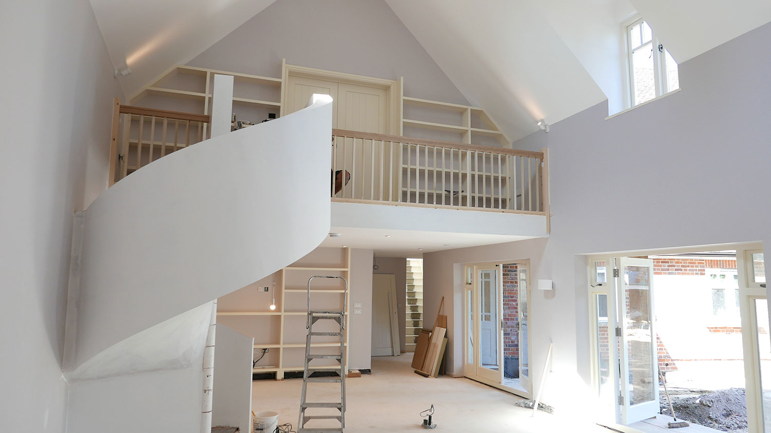 A large extension to a substantial early 20th century house to create a vast double height Entertaining Room with a spiral staircase to a galleried library. At first floor level a new Guest Suite has been created plus another staircase linking it to a new lobby and side entrance. The external area in front of the extension will be landscaped with a formal garden within a courtyard formed by the new garage building.