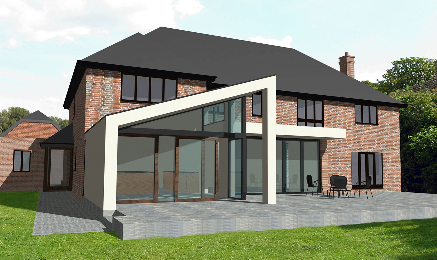 A bold, contemporary style new extension to a traditional 1980's detached house. Creating an enlarged kitchen and family room with direct access to generous terracing overlooking the andscaped rear garden. Also a new side extension is to be constructed linking the main house with the large garage to the front of the property.